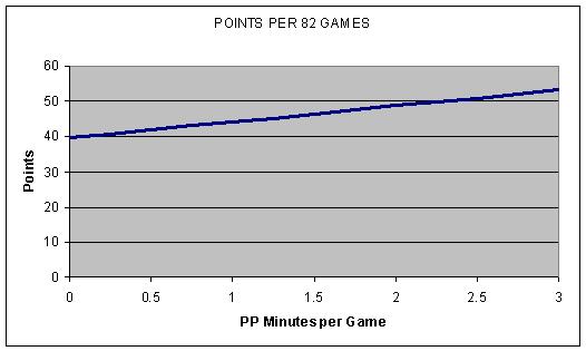 I think it's instructive to look at what would happen if we had a forward who played 18 minutes a game and was completely average at even-strength, on the power-play and on the PK. If we take him from 15 minutes ES/3 minutes PK to 15 minutes ES/3 minutes PP, we see a completely different player: